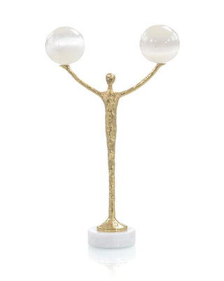 A brass figure on a white marble base stands with outstretched arms supporting two selenite balls. Disclaimer: Selenite is a natural crystalline material. By its sheer nature, imperfections such as other mineral deposits, which may appear as colored sections or varying crystalline structure, are not only expected, but indeed add to the beauty of the piece. The softness of selenite may result in separation of sections of crystal, which can be reattached with the use of a clear adhesive.