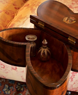 A marquetry inlaid butterfly work table, the top inlaid with morado, burl and amboyna and with two hinged ‘wing’ panels opening to reveal the painted Spencer crest, on a ring and baluster turned column and delicate down swept tapering legs and peg feet.