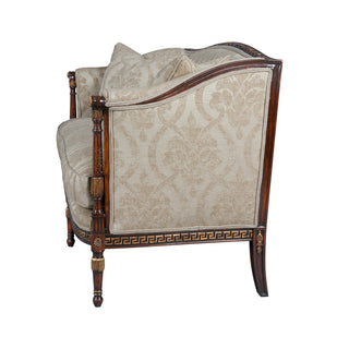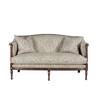 A finely carved and gilt Neo-classical sofa, the gently undulating rectangular padded back and arms with turned, fluted and leaf carved uprights above a Greek key frieze on turned legs. The original Regency, circa 1800.