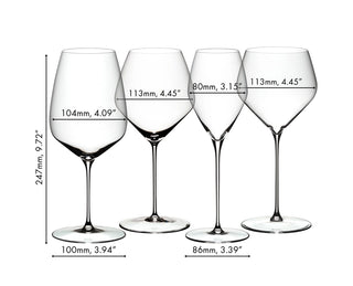 This Tasting Set contains 4 glasses from the RIEDEL Veloce series: Cabernet, Pinot Noir, Sauvignon Blanc and Chardonnay.