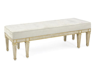 - Upholstered box seat is in a neutral fabric with contrasting welts