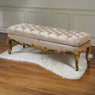 Transform your space with our exquisite blanket chest, featuring stunning hand-carving and a luxurious gold-gilded finish. Upholstered in elegantly tufted fabric, this piece not only offers a stylish storage solution but also adds a touch of sophistication to any room.