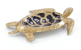 Handcrafted by artisans, the detailed texture on the antique brass finish of this turtle sculpture enhances the black shapes on the shell which form the bowl.