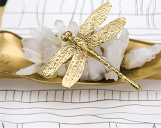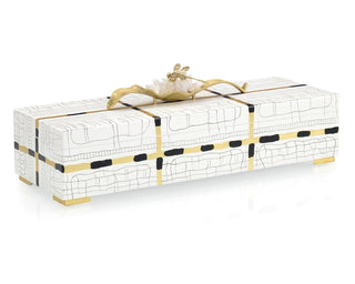 This whimsical, rectangular box in white with an organic checkerboard pattern in black and gold is accented with an antique brass dragonfly and leaf handle.