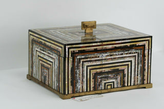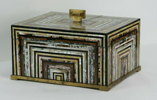 The Maitland Smith 8106-11 Pinstripe Box is a masterpiece of design and craftsmanship. This exquisite wooden box is inlaid with multi-colored shells, creating a striking pinstripe pattern that is both elegant and eye-catching. The antique brass accents add a luxurious touch, making this box a perfect addition to any sophisticated decor.