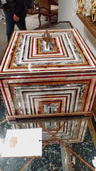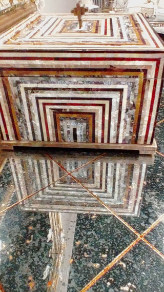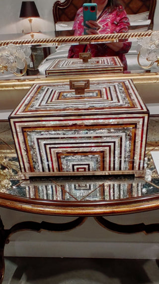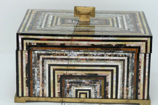 Multi Colored Shell Inlaid Wooden Box with Antique Brass Accents