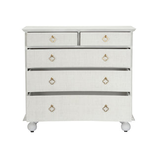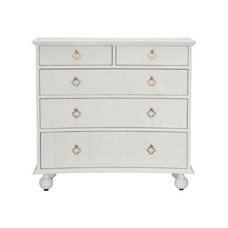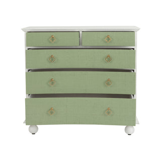 The Maxwell Chest is a stylish and versatile piece that seamlessly combines storage with coastal elegance. This 5-drawer storage chest features a wooden frame finished in a crisp white or a serene green, and is beautifully enhanced with raffia-wrapped drawers for a textured, natural look. Its antique brass hardware elevates the design, adding timeless appeal to any room.