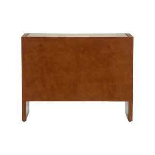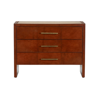 Elevate your home décor with the Santino 3-Drawer Chest, a stunning combination of timeless style and functional design. The rich leather-covered exterior in a warm cognac finish adds texture and sophistication to any space. Topped with a natural travertine stone surface, this piece offers a unique contrast of materials, blending organic beauty with modern elegance. With three spacious drawers, it provides ample storage while maintaining its sleek and refined appearance. Expertly crafted from premium materials, this chest is a luxurious and practical addition to bedrooms, living areas, or entryways.