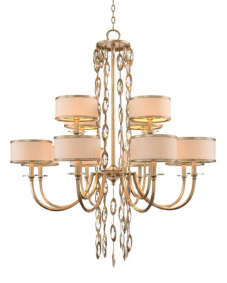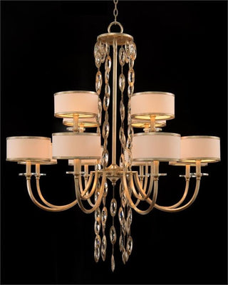 Twelve Light Counterpoint Chandelier. Shade: 8.25" X 8.25" X 4.25" White with gold lining. Candelabra base, type B, 60 watt max. Canopy 7.5". Counterpoint Collection twelve light chandelier has tailored cool white shades with gold lining. The faceted crystals are suspended in metal setting cut on the bias.