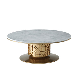 A circular Cocktail Table, the Bianco Carrara Marble Top with Brass Finish Molding Detail on a Gilt Bas Relief Column of Mughal Inspired Lattice Stars, on a Domed Disc Metal Base.