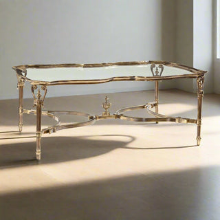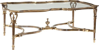 The Venice Cocktail Table exudes dimensional beauty through its antique finished cast brass Serpentine base. Its inset glass top highlights the intricate design of the base & adds a touch of elegance. This table effortlessly blends art & functionality, elevating your space with style & imagination.