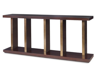 Enhance your living space with the Maitland Smith Fable Console Table, a striking blend of classic and contemporary design. This elegant console table is crafted from rich mahogany and features sleek bronze finished uprights that add a touch of modern sophistication. Measuring 72 inches wide, 14 inches deep, and 32 inches high, it offers ample surface space and a stylish presence, making it perfect for entryways, hallways, or behind sofas.
