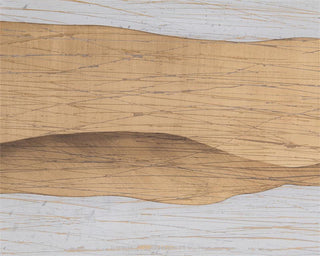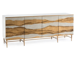 A clean, modern sideboard with a case in beluga and reverse-painted glass door fronts in a continuous golden dunes design. The doors are mounted with push-latches. The steel base, the top's front edge, and the door edges are in Etruscan gold. Behind each door is a single adjustable shelf.
