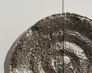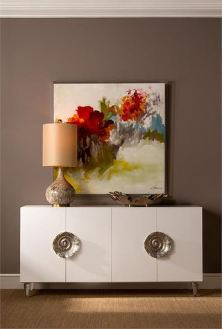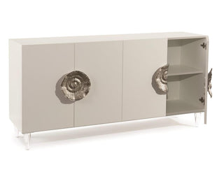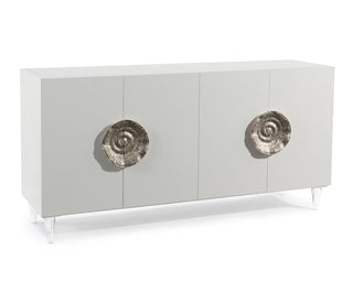 Standing on turned acrylic legs and finished in ice white, this four-door credenza has bold silvered escargot handles on each pair of doors. Each cupboard has one adjustable shelf.