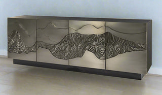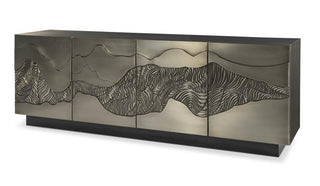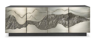 W: 84 in D: 20 in H: 31 in A German silver credenza featuring an organic motif on its door fronts, equipped with four push-to-open doors, adjustable interior shelves, and two interior drawers. Dimensions: W: 84 in, D: 20 in, H: 31 in.