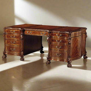 This lions partners desk features a hand inlay of Movingue and an antique brown leather top with hand applied gold and blind tooling. Brass handles, forged in our own foundry, adorn the drawers. The desk includes 5 upper box drawers – a center drawer and two in each pedestal. Solid oak drawer construction with hand-dovetail joinery at the front and rear ensures long-lasting stability. File drawers are located on the left and right pedestals, as well as at the front and back of this timeless design. The intricate clarity and depth of the lion carving and the paw feet on each pedestal turns this functional desk into an artistic sculpture. Beautiful Crotch Mahogany gives this desk a delicate yet exquisitely detailed appearance, reminiscent of glamorous 18th-century antiques.