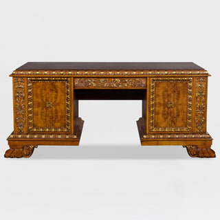 The Le Grand Writing Desk is a luxurious addition to any workspace. Crafted from solid wood, its sleek curved lines and rich ash finish add sophistication and elegance to any room. This desk features two drawers with antique metal pulls, providing ample space for all of your writing and organizational needs. The spacious desktop provides plenty of room to work in comfort and style. With its beautiful design, the Le Grand Writing Desk will bring a touch of luxury to any interior design or businessman’s office.