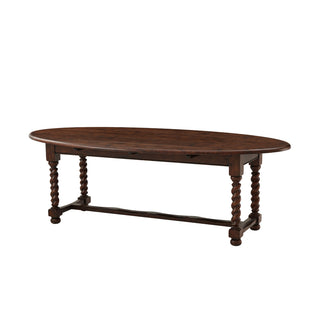 A drop leaf dining table featuring an oval rustic oak veneered top on four spiral columns joined by chipped carved stretcher. When leaves are dropped, this lovely piece can be used as a large console table.
