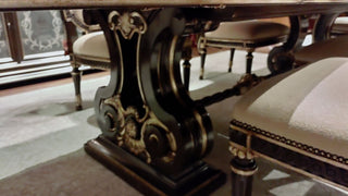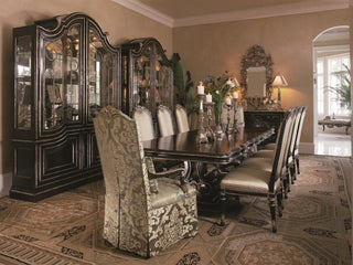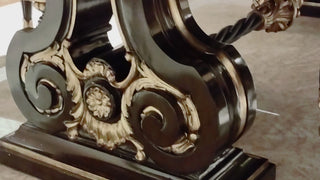 Solid Malay Beech Wood in Old World Orleans finish with hand carved and gilded Versailles trim. Two flipped Ionic style legs are classically adorned with Versailles trim. Twisted wrought-iron stretcher bar at base strengthens the profile of this table in Versailles finish. Includes removable leaf extension