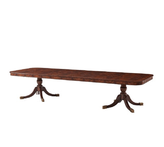 A fine mahogany and flame veneered extending dining table, the rectangular reeded edge top with rounded corners crossbanded in chestnut burl and morado, with two additional self storing leaves, above a mahogany apron, on two baluster turned pedestals each issuing four downswept legs terminating in finely leaf cast brass cappings.
