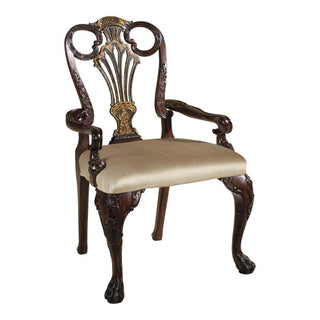 Carved Antique Mahogany and Black Chinoiserie Finished Arm Chair, Neutral Fabric Upholstery