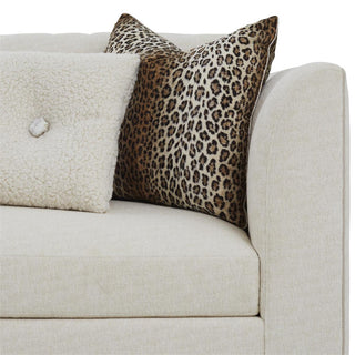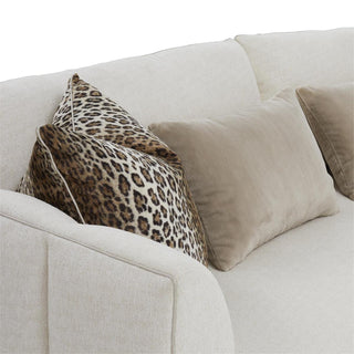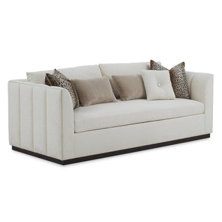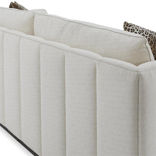 The Paris Sofa displays a plinth base of beech wood in an espresso finish, paired with upholstered channel detailing along the inside and outside of the back. The piece is shown in gorgeous Monk Parchment 2213 fabric, accented with a small welt trim in Gimlet String 1120 along the frame. Five throw pillows in a variety of fabrics, one with a quartz crystal, are included with the piece.
