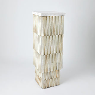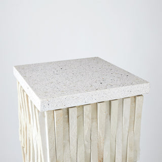 Stone from the desert of Rajasthan is hand chiseled and sculpted by artisans to create this sculptural pedestal. The Pedestal has a removable terrazzo top and four adjustable nylon glides on the base. The table can be used indoors or outdoors.