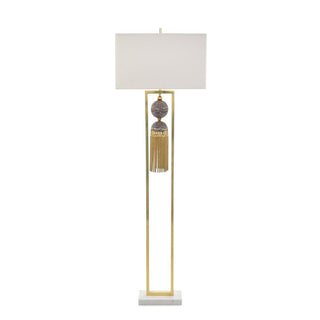 This floor lamp features a hand-braided tassel encased in a solid brass frame atop a marble base.