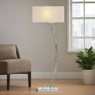 The Floral Floor Lamp features a rectangular body of Polished Stainless Steel alongside a matching base. Perfectly framed in the center of the piece, a stunning brass branch extends upwards to reveal a collection of delicate white flowers. The finial, a continuation of the white cherry blossoms, gracefully ties the piece together. This lamp is a masterful display of intelligently fusing clean, modern design with the organic curvature present in nature.