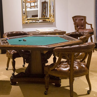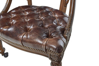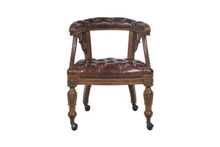 Elevate your gaming or relaxation experience with our Gentry Game Chair. Its carved Napoleon brown finish with Briarwood leather upholstery & brass accents offers charm & style, while its exceptional craftsmanship ensures ultimate comfort. Add it to your game room or living space for hours of deluxe seating.