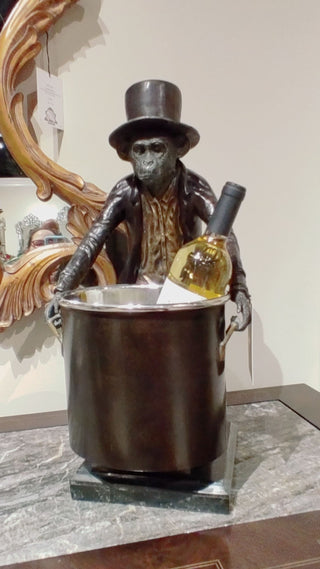 Introducing the Maitland Smith 8125-12 Server Monkey Wine Holder, a unique and whimsical addition to your home décor. This intricately crafted wine holder features a charming monkey design made from dark bronze and verdigris-finished brass, perched on a sturdy black wax stone base.