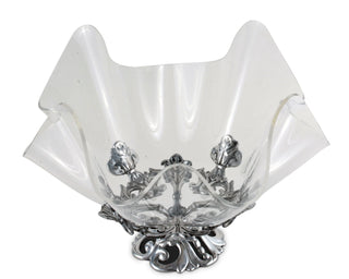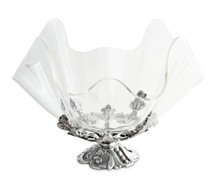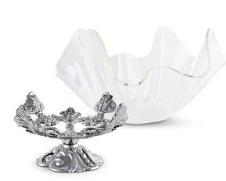 Arthur Courts 14" bowl with fleur-de-lis symbols stack on top of each other at the base before swirling out in each direction. More handmade, aluminum emblems extend up the sides of the bowl, illuminating in a brilliant luster against the acrylic.