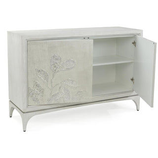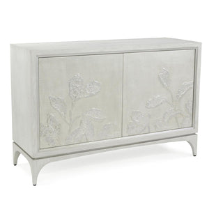 The Cressida Two-Door Chest features a modern interpretation of embossed leaves in washed silver bringing them to life in full vibrancy. The case is wrapped in oak finished in our Carrera white. The doors are completed with push latches and European hinges.