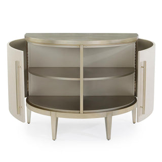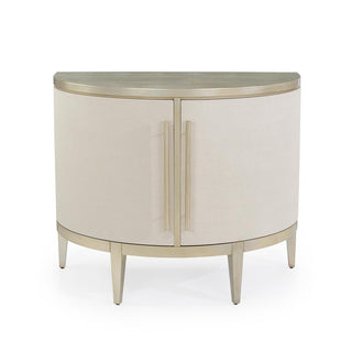 Le Champs classic two-door demilune is wrapped in our washed linen and the accents are finished with our champagne metallic. The doors use brass hinges and completed with long modern cylinder hardware.