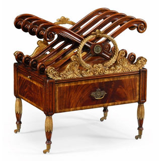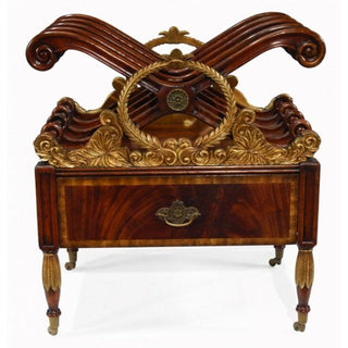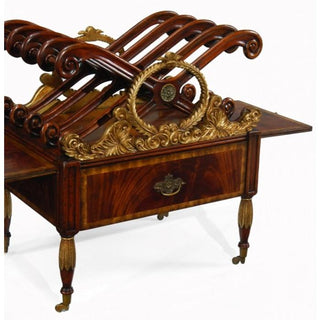Impressive empire style mahogany and crossbanded crotch mahogany veneered canterbury, the four storage areas separated in the upper section by X-frame supports, and terminating at either end with finely carved gilt wreaths and floral bands. Single large drawer above baluster legs with further gilding and patinated brass sleeves and castors.