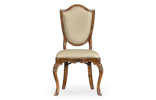 Classic Hepplewhite style satinwood side chair with an upholstered shieldback and seat in MAZO, the slender cabriole legs and seat rail with shallow carved rococo details of shells and leaves. The foot is enhanced with a finely carved sabot. After an original of c.1770.
