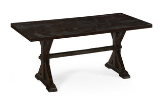 Rectangular solid dark ale topped medium dining table with a rustic finish revealing exposed saw marks. Mortice and tenon joints to stretcher and uprights.