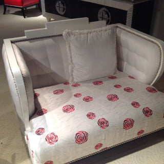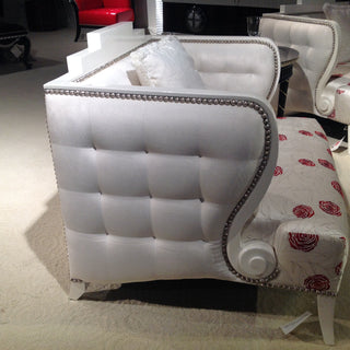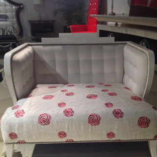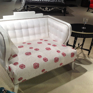 HIGH GLOSS WHITE LCQUER, PAINTED WHITE, LARGE DAISY SILVER STUDS, EMBOSSED RED ROSE HIGH QUALITY UPHOLSTERY. TUFTED BACK AND SIDES Item D526.01 / CHAIR, High Gloss White Lacquer, Painted White, Large Daisy Silver Studs, Embossed Red Rose High-Quality Upholstery. Tufted Back and Sides. Width: 235 cm, Depth: 87 cm, Height: 84 cm.