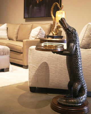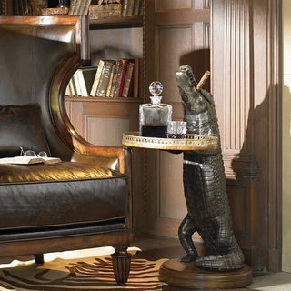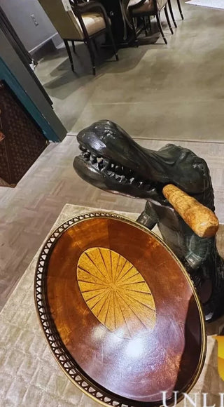 The Alligator Occasional Table is cast in resin and finished in rich verdigris green. His tray table features hand-laid marquetry inlay from a variety of beautiful wood species. With brass gallery accents and a cheeky cigar between his teeth, bring home this true “conversation piece” for your living room, office, or lounge today.