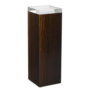 A square pedestal with a faux crocodile inlay is finished in a variegated black with distressed gold cerusing. This piece pairs with a crystal glass block top.