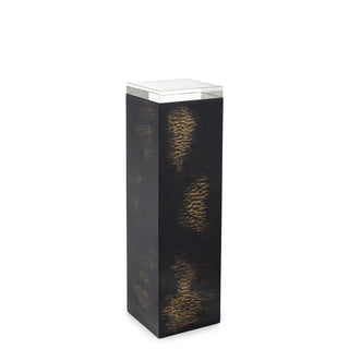 The Draco Pedestal features a classic rectangular profile that is elevated by a debonair black lacquered finish. Across the black exterior, a plethora of golden scales adorn the body, imbuing the piece with unforgettable personality and establishing stunning visual interest. Perched atop the Draco Pedestal is a squared surface of clear crystal, providing stunning juxtaposition to the black and gold hues, completing the look. A gorgeous piece by itself, this pedestal can be arranged alongside its multiple variants to result in creative custom arrangements.