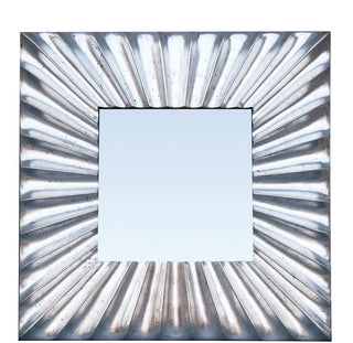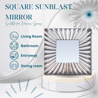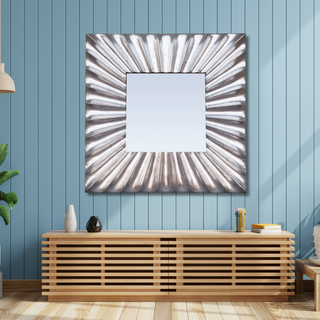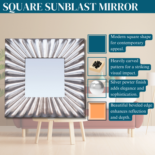 Bring contemporary style to any room with the Square Sunblast Mirror! Its unique square shape and beveled edge are highlighted by the intricate carved pattern and modern silver pewter finish. Add a touch of elegance and depth to your space with this stunning mirror.