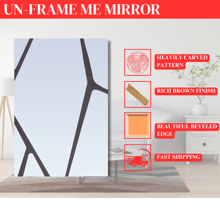 This modern beveled mirror boasts a heavily carved pattern finished in brown and a beautiful beveled edge. With an elegant rectangular shape, it adds a touch of sophistication to any room. Enhance your space with this sleek and stylish Un-Frame Me Mirror.
