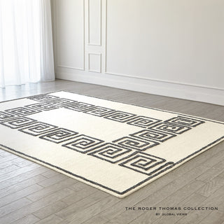 The Alexander Rug's charcoal on white pallet will be a dramatic complement to any room and the inset pinwheel border design is the perfect frame. 100% hand-tufted wool with cut and pile Greek Key pattern.