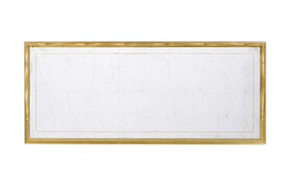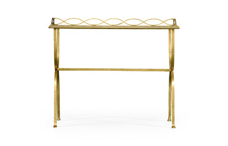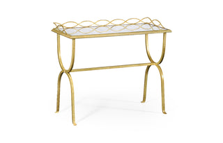 Contemporary rectangluar wrought iron wine or drinks table with an antique gilded finish and Églomisé top. Undulating gilded gallery to sides and rear. The base comprising inverted horseshoe supports. Great in the powder room!
