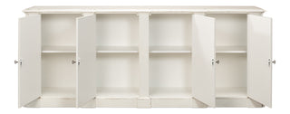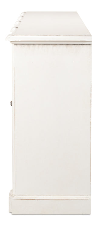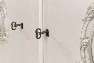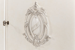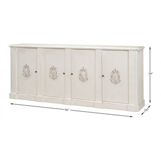 The white-crested Italian wall cabinet has been spotted. It is more beautiful than ever described or even anticipated. It is made of solid pine and measures 96 x 18 x 39. The emblems on the four doors give it its name. Rare but not endangered.