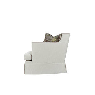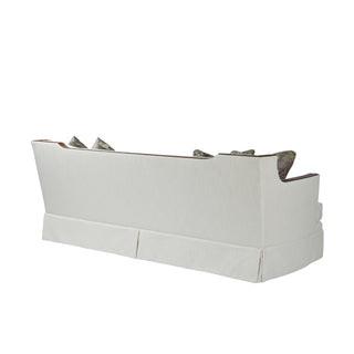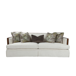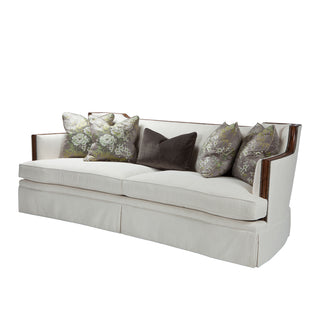 An upholstered sofa, the moulded edge frame with chestnut burl inlay, the upholstered back and arms with four Canadian down throw pillows and one kidney pillow standard on a twin cushion seat, above a kick pleat skirt. Inspired by a 20th century Scandinavian original.