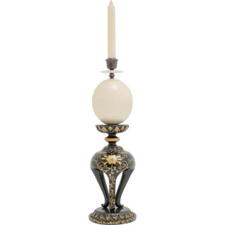 Aged Black Lacquer Shikki Candlestick, Hand Painted Gold Accents, Ostrich Egg Motif by Tony Duquette