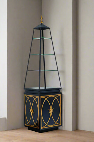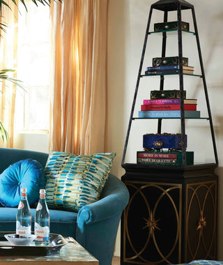 Width: 22 in, Depth: 20 in, Height: 89 in. Discover the elegance of this textured black lacquer-finished open etagere, beautifully accented with soft brass details. It's the perfect blend of style and functionality for any space.