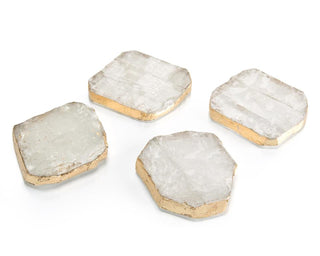 The Set of Four Selenite Coasters is trimmed in hand-applied gold leaf. This touch of elegance is the perfect hostess gift. Disclaimer: Variations in size, shape, and color are normal with natural stones.